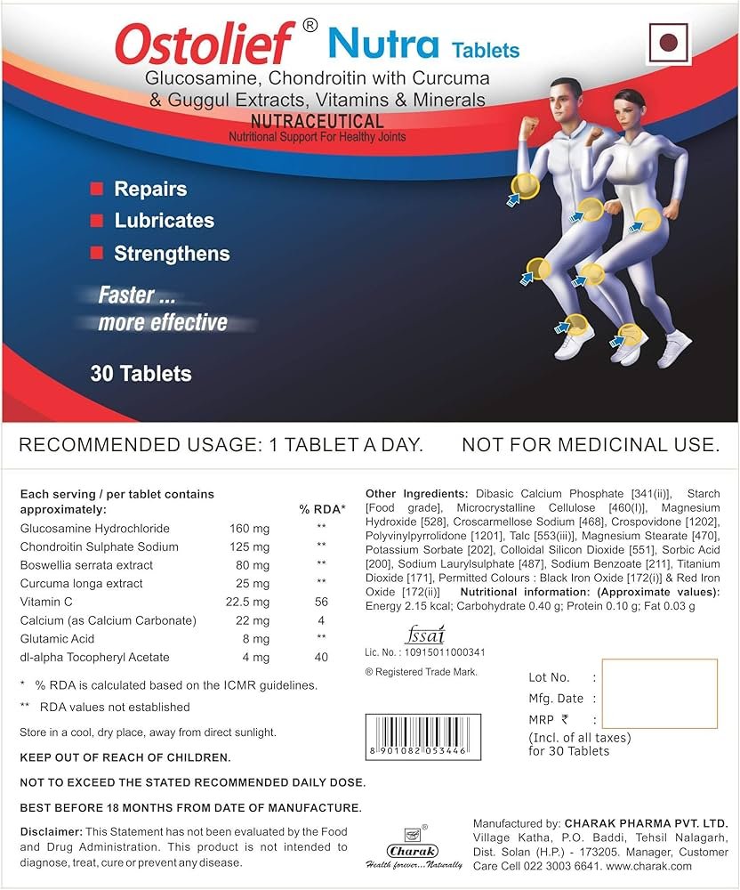 Charak Ostolief Nutra Tablets (30 Tablets) is a nutraceutical supplement that combines herbal extracts and nutritional components to support joint health and manage osteoarthritis.