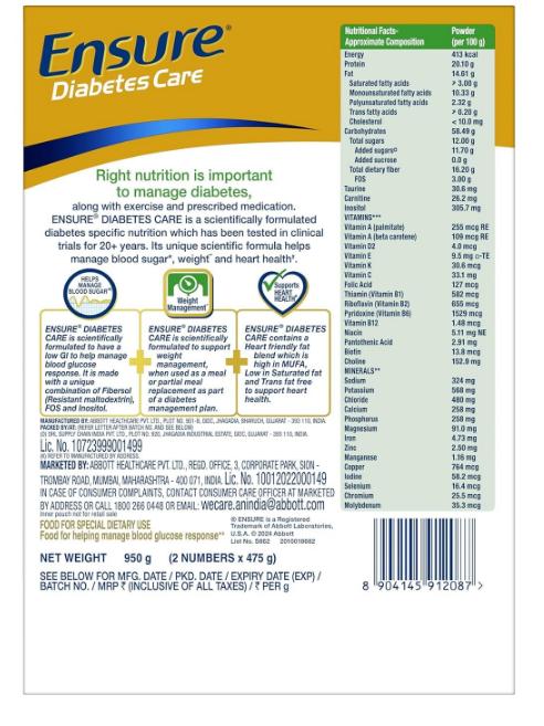 Ensure Diabetes Care Vanilla Flavour Powder (950g) is a scientifically formulated nutritional supplement tailored to assist in managing diabetes-related health concerns. Enriched with 36 essential nutrients, including high-quality milk protein, vitamins A, C, D, E, and B-complex, along with minerals like calcium and magnesium, it provides comprehensive nutritional support. The inclusion of Fructo-Oligosaccharides (FOS) and a heart-friendly fat blend rich in monounsaturated fats (MUFA) aids in maintaining digestive health and cardiovascular well-being. With a low glycemic index and slow-release carbohydrates, it helps manage blood glucose levels and provides sustained energy throughout the day. This gluten-free, vegetarian supplement is suitable for adults and can be consumed as part of a balanced diet to support overall health and wellness.