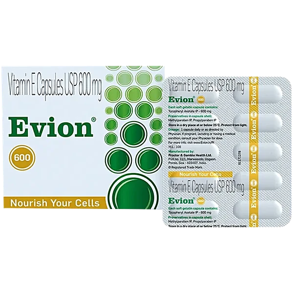 Evion 600mg Capsule is a high-potency Vitamin E supplement designed to support cellular health and overall well-being.