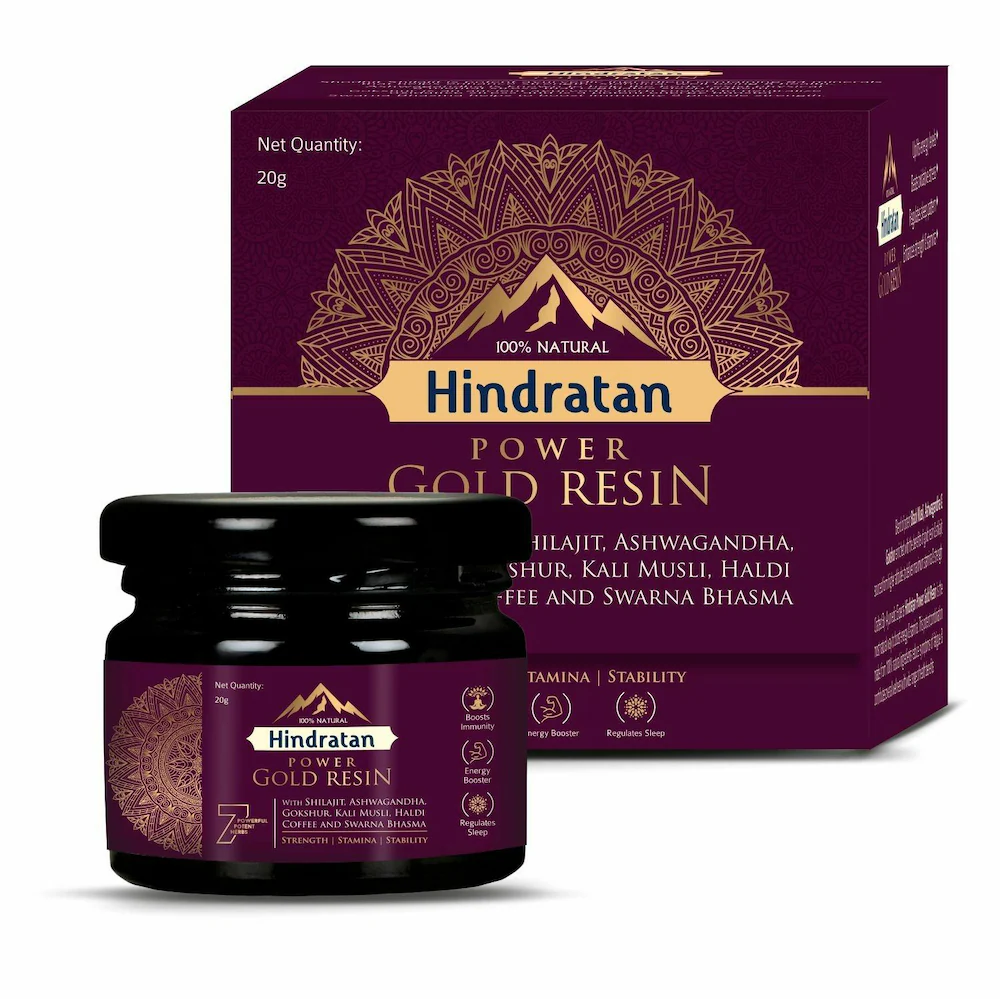 Leeford Hindratan Power Gold Resin (20g) is an Ayurvedic supplement formulated to enhance stamina, energy, immunity, and regulate sleep, featuring 100% pure Shilajit, Ashwagandha, Coffee, and Swarna Bhasma.