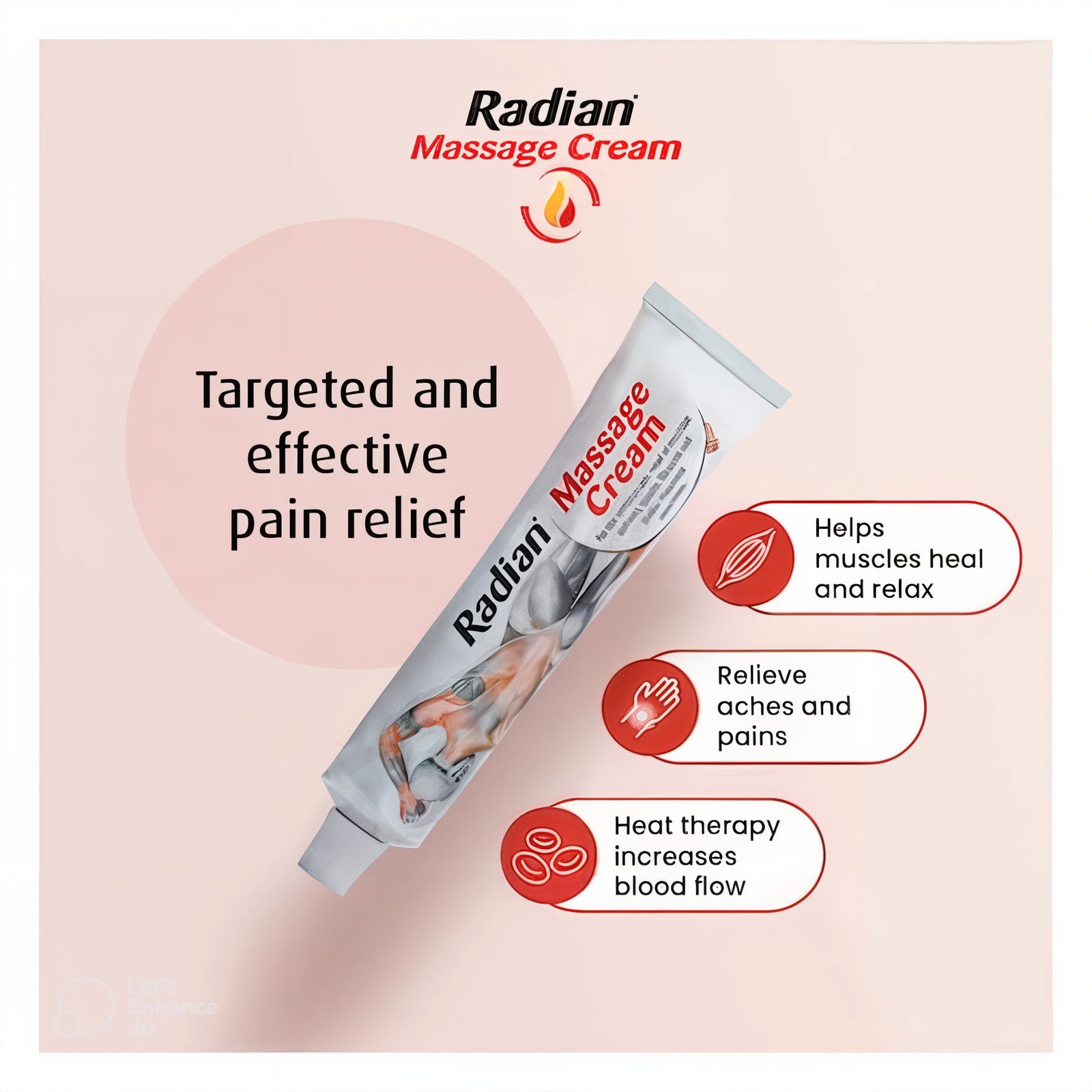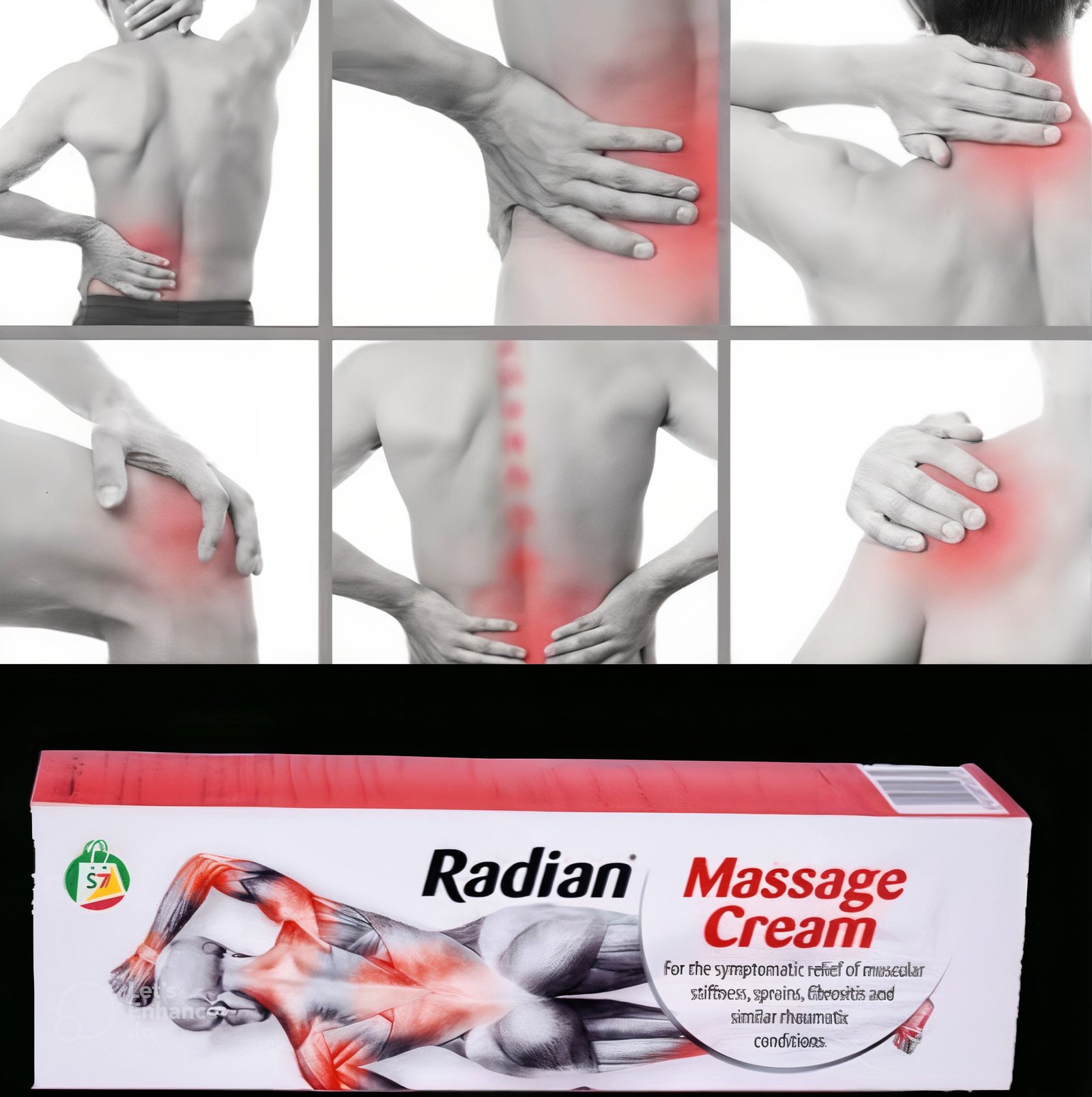 Radian Massage Cream is a trusted, fast-acting topical formulation designed to provide instant relief from muscular aches, joint pain, stiffness, sprains, and rheumatic conditions. Enriched with deep-penetrating ingredients, it delivers targeted comfort to affected areas such as the back, shoulders, neck, and knees. The smooth, non-greasy texture ensures easy application and rapid absorption, making it ideal for everyday use. Whether you’re dealing with post-workout soreness, occupational fatigue, or chronic discomfort, Radian Massage Cream is formulated to ease pain and restore mobility—so you can get back to your active lifestyle with confidence.